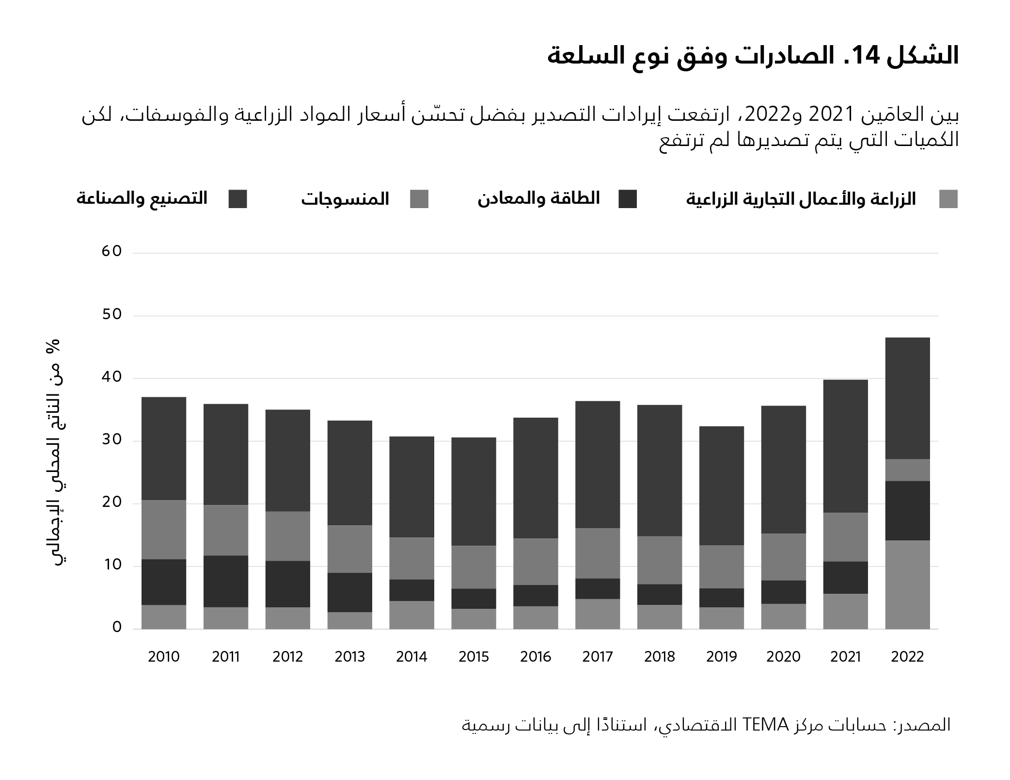 في الأعوام الأخيرة، سجّل العجز في الميزان التجاري ارتفاعًا كبيرًا بسبب الزيادة في الأسعار الدولية للوقود والمواد الغذائية. وازدادت الصادرات أيضًا بسبب تضخّم الأسعار، ولكن الأسعار ارتفعت على الرغم من انخفاض كمية المنتجات المصدَّرة. ويعبّر سوء أداء الصادرات عن زيادة القيود التمويلية المفروضة على القطاع الخاص، وضعف الطلب الأوروبي على المنتجات التونسية، وانخفاض الاستثمارات الخارجية في تونس بوصفها منصة تصدير. ويُعزى تراجع الصناعات المعدّة للتصدير إلى التدنّي المستمر في وتيرة التصنيع، فقد انخفضت حصّة هذه الصناعات من المنتجات ذات القيمة المضافة من 25.2 في المئة في العام 2010 إلى 20 في المئة في العام 2022 (انظر الشكل 14). ويعكس هذا التراجع في الصادرات الصناعية، جزئيًا، إخفاق تونس في زيادة تطوّر حزمة صادراتها مع مرور الوقت بسبب النقص على مستويات الابتكار، والبحث والتطوير، وتعزيز المهارات. هذا فضلًا عن أن اتفاق الشراكة الذي وقّعته البلاد مع الاتحاد الأوروبي في العام 1995 لم يسمح بزيادة الصادرات الزراعية، وقد انهارت كذلك صادرات الفوسفات بسبب تراجع الاستثمارات والخلافات العمّالية طوال سنوات.